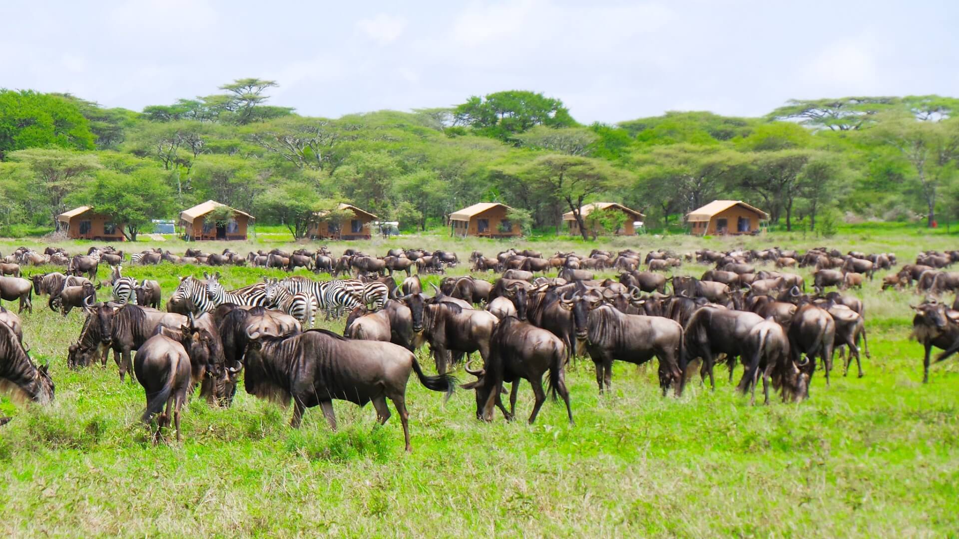 Luxury safari tents nestled near acacia trees with zebras and wildebeests grazing on the vast open savannah